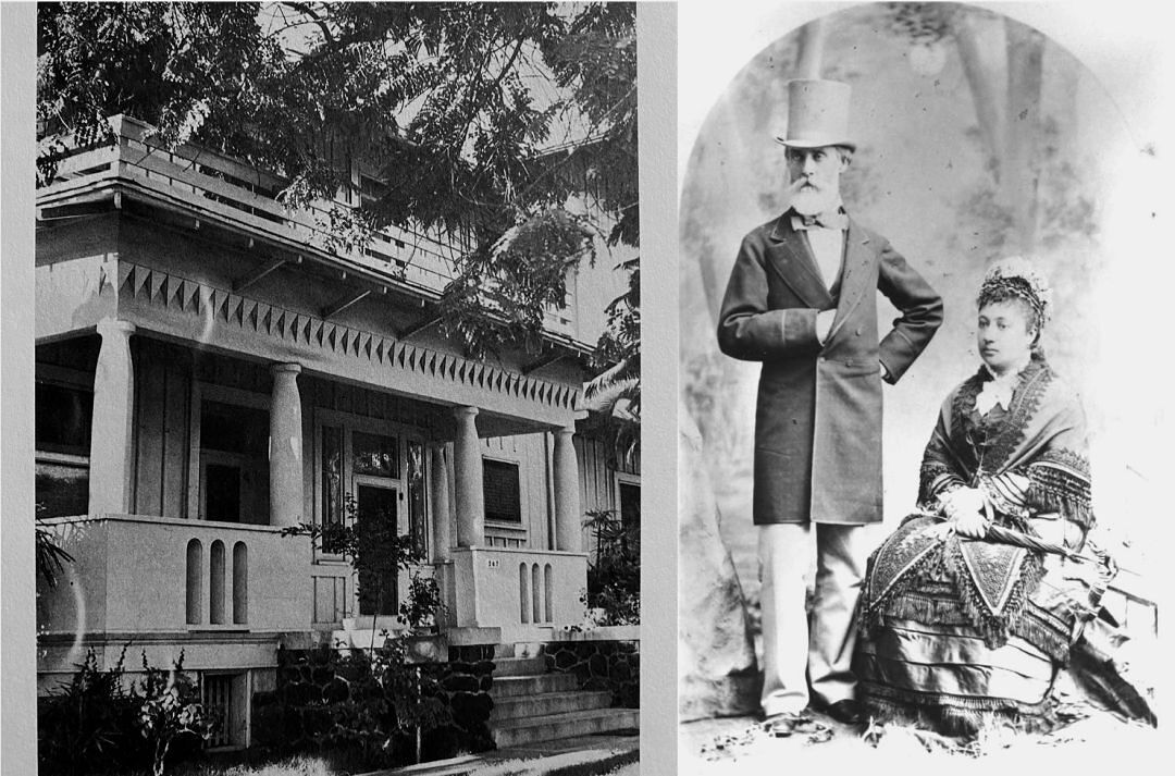 Left: The Kaʻiulani Home on King Street, which was located where Kawaiahaʻo Plaza is located today (D. Mitchell “Kū Kilakila o Kamehameha,” 1993) Right: Charles Reed Bishop and Princess Bernice Pauahi Bishop in San Francisco, 1875. Photo: Kamehameha Schools Archives.
