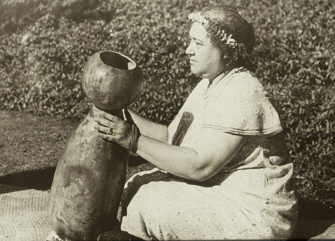 Mary Kawena Pukui with an ipu. Photo courtesy of Bishop Museum.