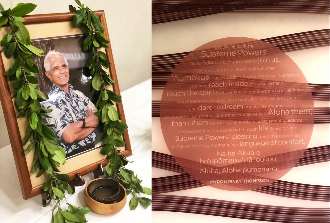 “Let us call forth the Supreme Powers of our individual spiritual beliefs to join us. For those who have them, call forth their ʻAumākua – our Guardian Angels – to be with us today. And now reach inside of ourselves and touch the spirits of our family members and special friends who have assisted us to be people who care, want to share, and dare to dream impossible dreams. Let us gather our spiritual strengths so that we can Aloha them, thank them, for their continued encouragement, guidance, and protection as we proceed through life. Now, for our Supreme Powers’ blessing upon this gathering: in the words of my mother in her language of comfort, na ke Akua e hoʻopōmaikaʻi iā ʻoukou.”