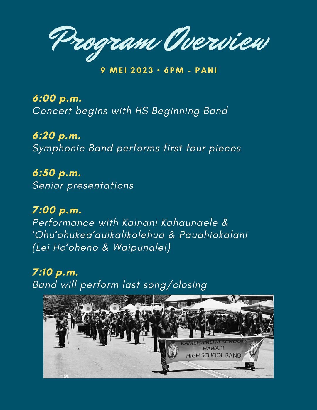 The Kamehameha Hawaiʻi High School Band and Hawaiian Ensemble will present their 2023 Spring Concert at Lunalilo Hale on Tuesday, May 9, 2023 at 6pm. They will be presenting various mele and will feature the leo nahenahe of a special guest, Kainani Kahaunaele! E hoʻonanea mai!