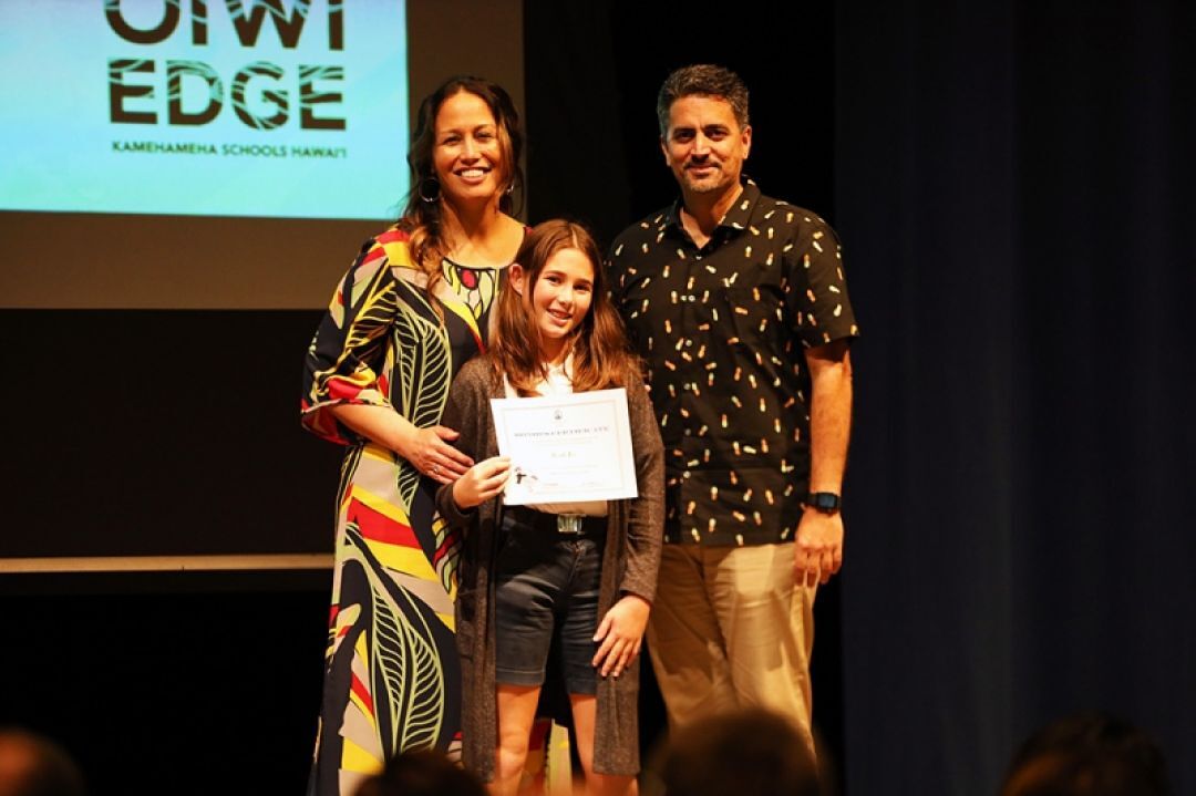 6th grader Koali Ito accepts her Poʻo Kula list award from Poʻo Kula Naeʻole-Wong and Hope Poʻo Kula De Sa.