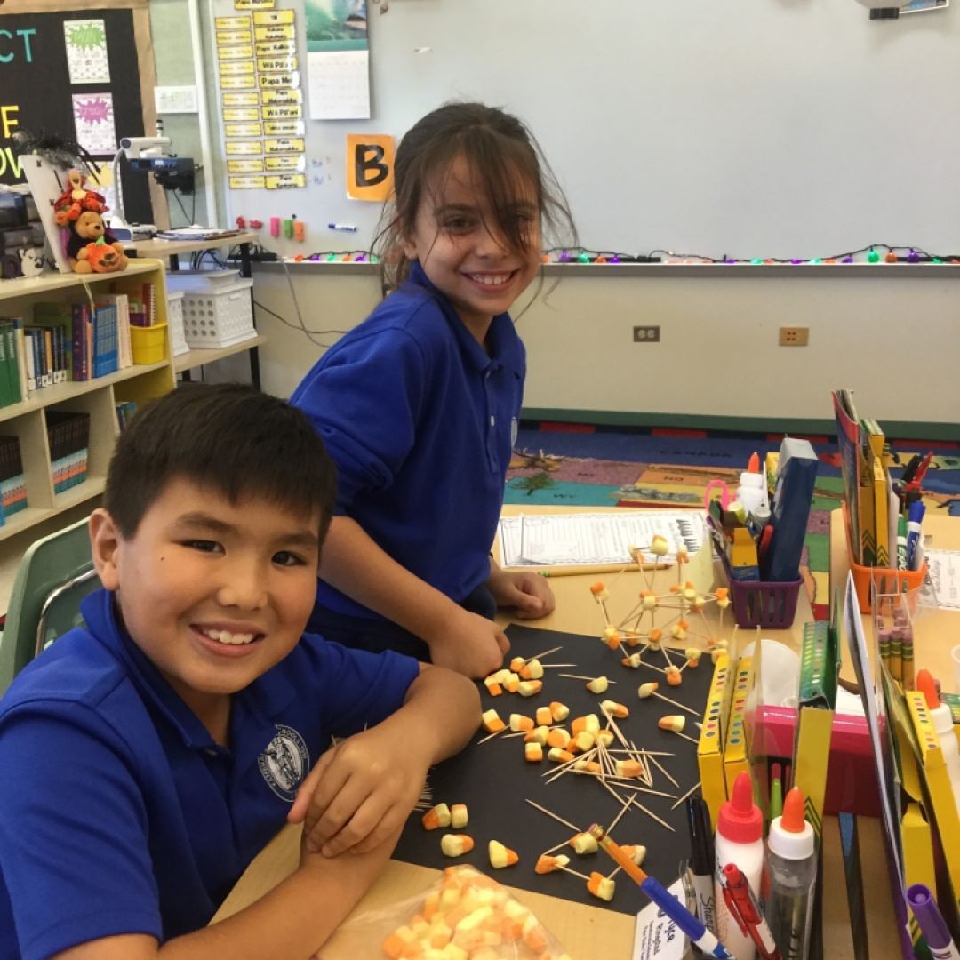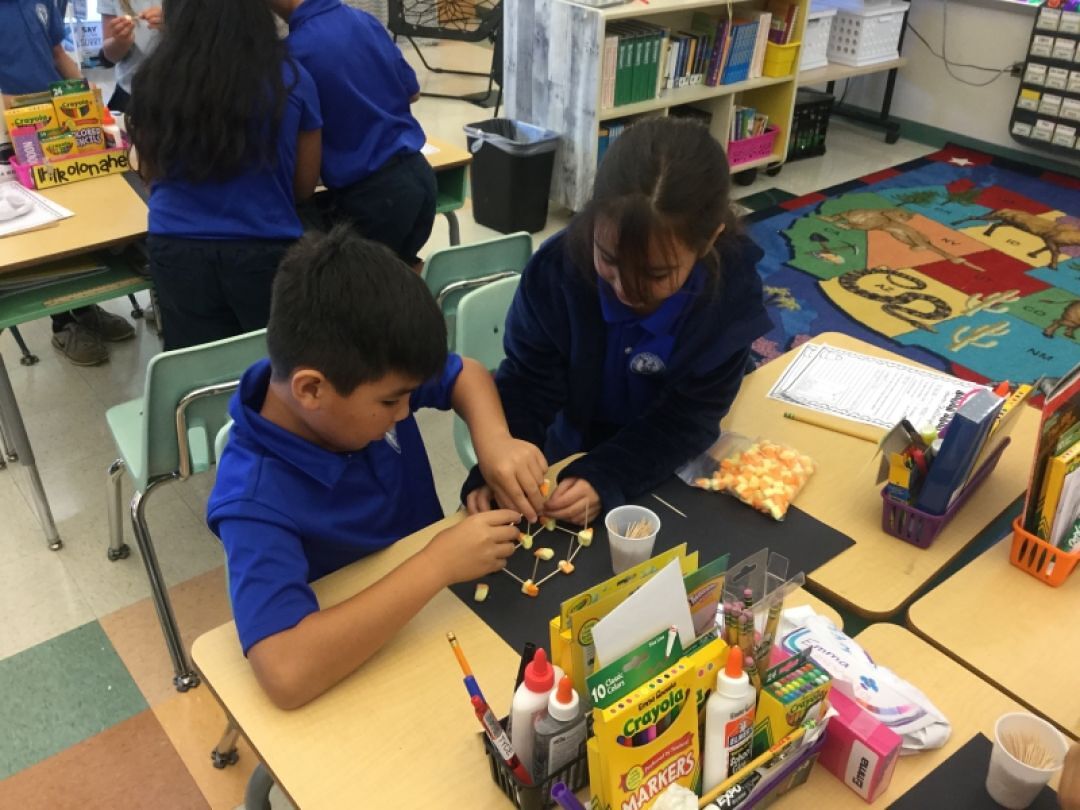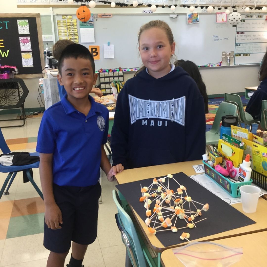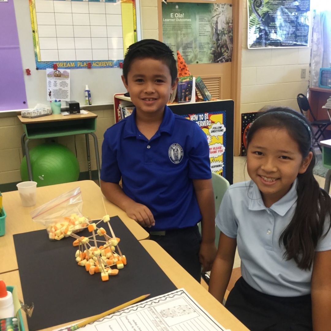 Third graders in Kumu Kamaʻs class engaged in the Candy Corn Tower Challenge. The goal of this investigation was to build the tallest free-standing structure using only 100 toothpicks and 2 cups of candy corn marshmallows. Students worked in pairs to share different ideas on how to solve the problem. Pairs completed a STEM investigation sheet where they wrote a plan of action and sketched what they envisioned. Groups worked for 8 minutes, then reflected on how they could improve their creation. At this point, many pairs revised their original thoughts. Students then collaborated and created for another 7 minutes, putting their revised plan into action. At the end of the challenge, students recorded what they ended up doing to design and bulld their tower, described the outcome of the challenge, and reflected on what worked well during the challenge, what didnʻt work well, and how they would improve their design next time.