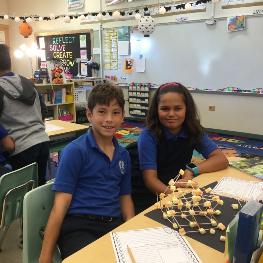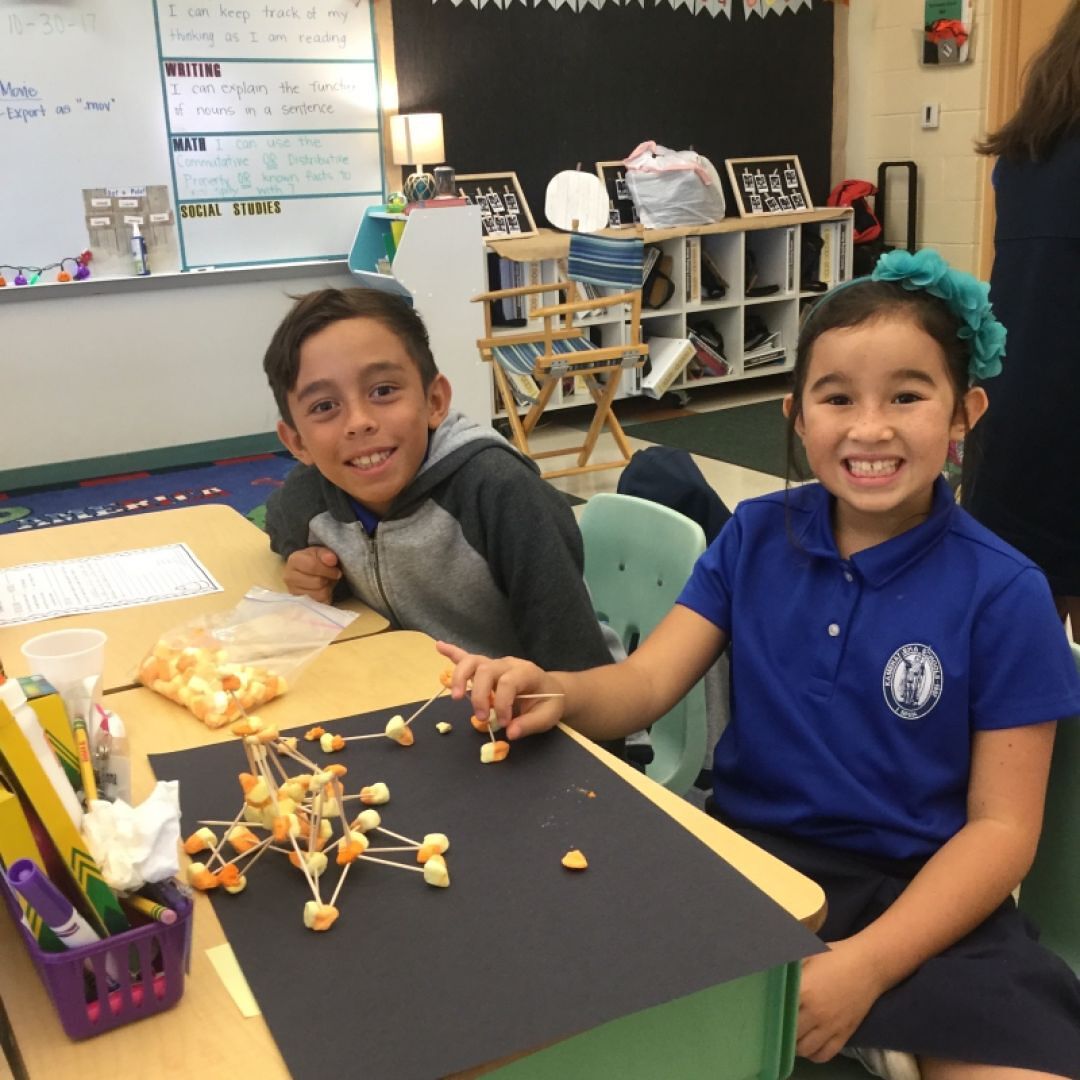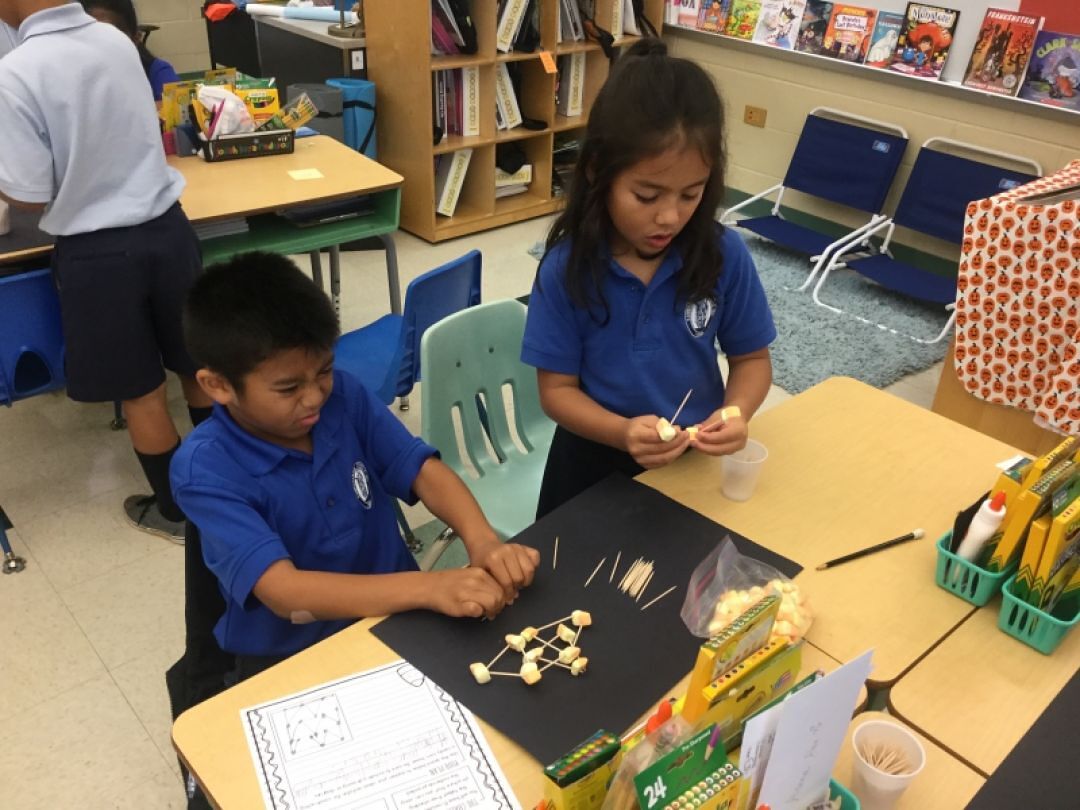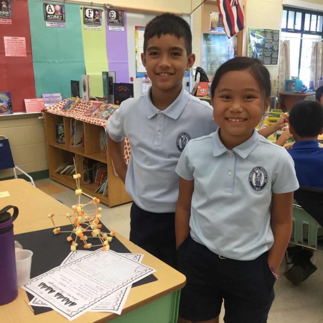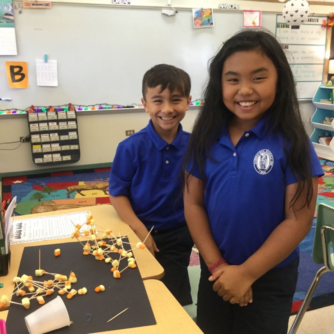 Third graders in Kumu Kamaʻs class engaged in the Candy Corn Tower Challenge. The goal of this investigation was to build the tallest free-standing structure using only 100 toothpicks and 2 cups of candy corn marshmallows. Students worked in pairs to share different ideas on how to solve the problem. Pairs completed a STEM investigation sheet where they wrote a plan of action and sketched what they envisioned. Groups worked for 8 minutes, then reflected on how they could improve their creation. At this point, many pairs revised their original thoughts. Students then collaborated and created for another 7 minutes, putting their revised plan into action. At the end of the challenge, students recorded what they ended up doing to design and bulld their tower, described the outcome of the challenge, and reflected on what worked well during the challenge, what didnʻt work well, and how they would improve their design next time.