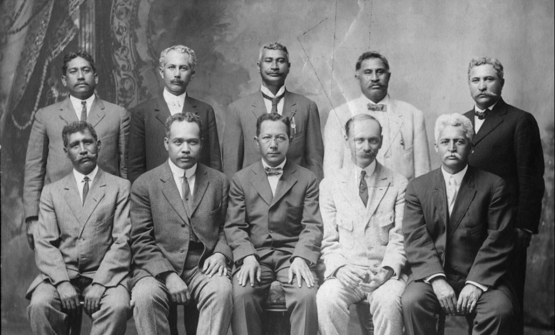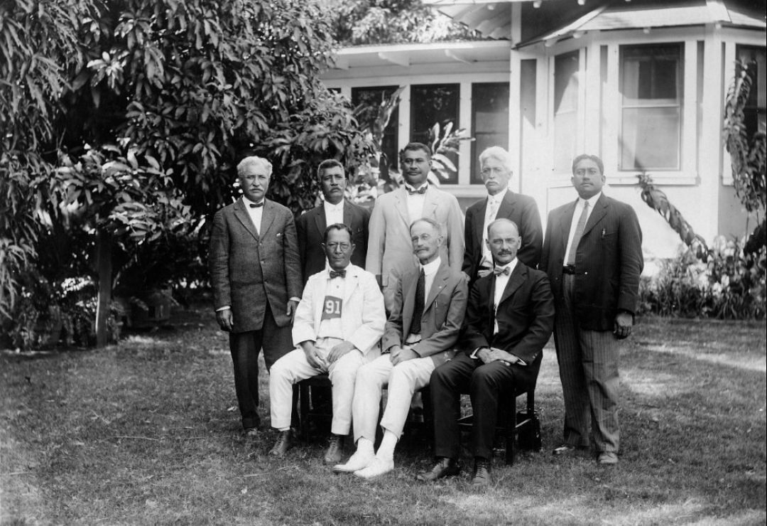 Members of the Class of 1891, Circa 1930. Seated: William Crowell, Throdore Richards (Principal), Charles E. King. Standing: Judge William K. Rathburn, Soloman Hanohano, William Keolanui, Samuel Keliinoi, Thomas Haae.