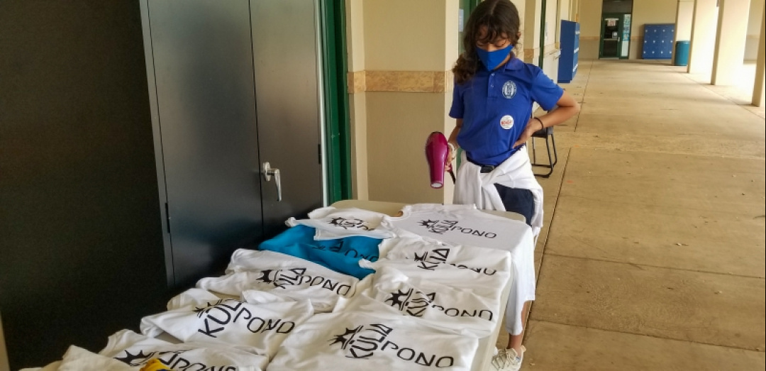 When Kumu Eva was asked about what positive impact the Lā Kūʻokoʻa t-shirts have she replied, “The shirts are a great idea! Our message can be shared anytime, anywhere.” Kumu Eva runs the printing tables and sees the excitement our students have in making the shirt. For most students, this is the first time they are printing a message they can wear. Many have created posters for sign-waving, but now they get to wear their message and our students have come to enjoy communicating through wearable fashion.