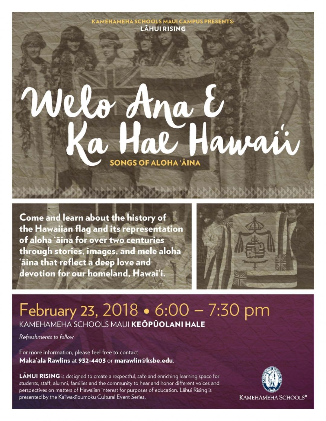 “Welo Ana E Ka Hae Hawaiʻi: Songs of Aloha ʻĀina” will take place from 6:00 – 7:30 p.m. in Keōpūolani Hale on the Kamehameha Schools Maui campus. Refreshments will follow the presentation.