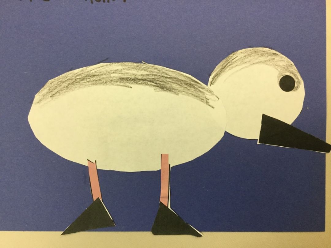 Students use 2-D shapes to make an uaʻu, while learning about its characteristics- pink legs, black feet, black top feathers and white feathers underneath.