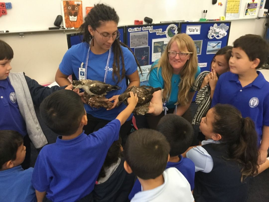To end the unit, Maui Nui Seabird Recovery Project gave the haumāna an opportunity to touch a taxidermy uaʻu, aʻo, and uaʻu kani. The presenters had a fun lesson for the haumāna to act out a family of uaʻu and learn the effects of ocean pollution.