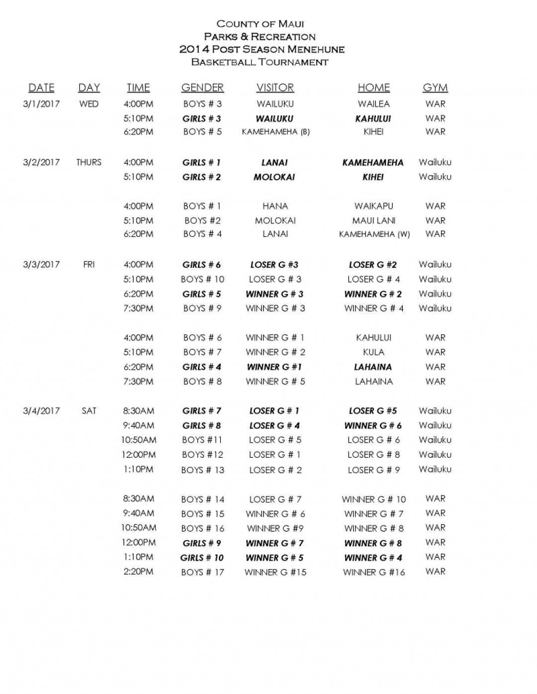 This past year was the first time our school has been able to participate in the Menehune League. Our three teams—Girls, Blue, and White—will take part in the post-season tournament that takes place March 1st through the 4th at War Memorial and the Old Wailuku Gym. The double elimination tournament will include the regular tournament teams, as well as Hana, Lana`i, and Moloka`i. The first round consists of the following KSM games: