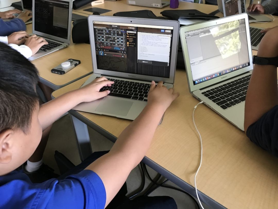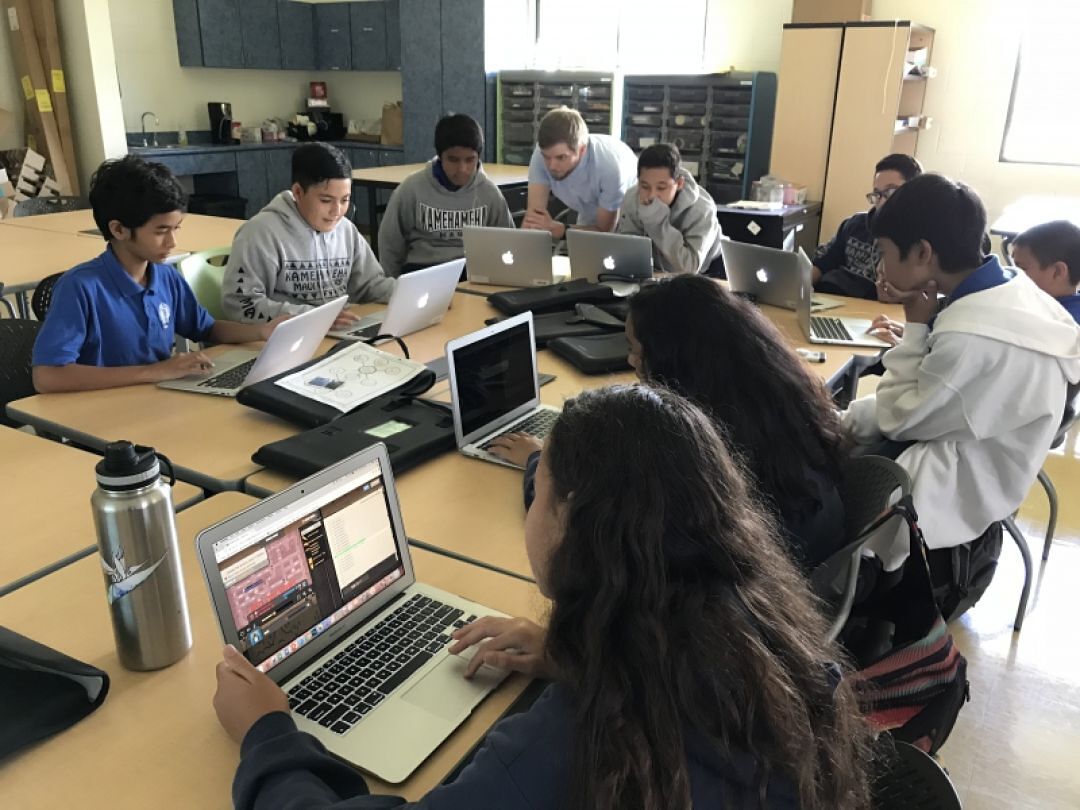 David Pickett is a part of the Purple Maiʻa Foundation, a non-profit organization that aims to teach beginning coding and computer science to young students. Mr. Pickett's ambitions and expectations for the students in the class are set high. He is teaching students programming logic and how to code the same way it's done in real-world projects. Most beginning programming classes are taught using drag-and-drop logic blocks in programs like Scratch or Lego Robotics. This is great for learning the logic of how programs work, but in commercial applications programs are made starting with what is essentially an empty text file and code is typed in manually. The difference is like microwaving a TV dinner versus making a meal totally from scratch.