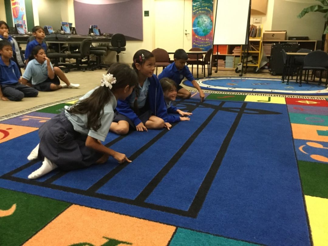 The staff comprises of five lines and four spaces. Each of those lines and spaces represents a different letter, which in turn symbolizes a note. Kumu Lum Ho taught students a catchy phrase to help them understand note placement; “every good boy does fine” for the notes E, G,B,D and F which is placed on the lines as well as “face in the space” for the notes F, A, C and E which are placed alphabetically in the spaces up the staff. He then allowed the students to play a game which helped to visually reinforce this lesson.
