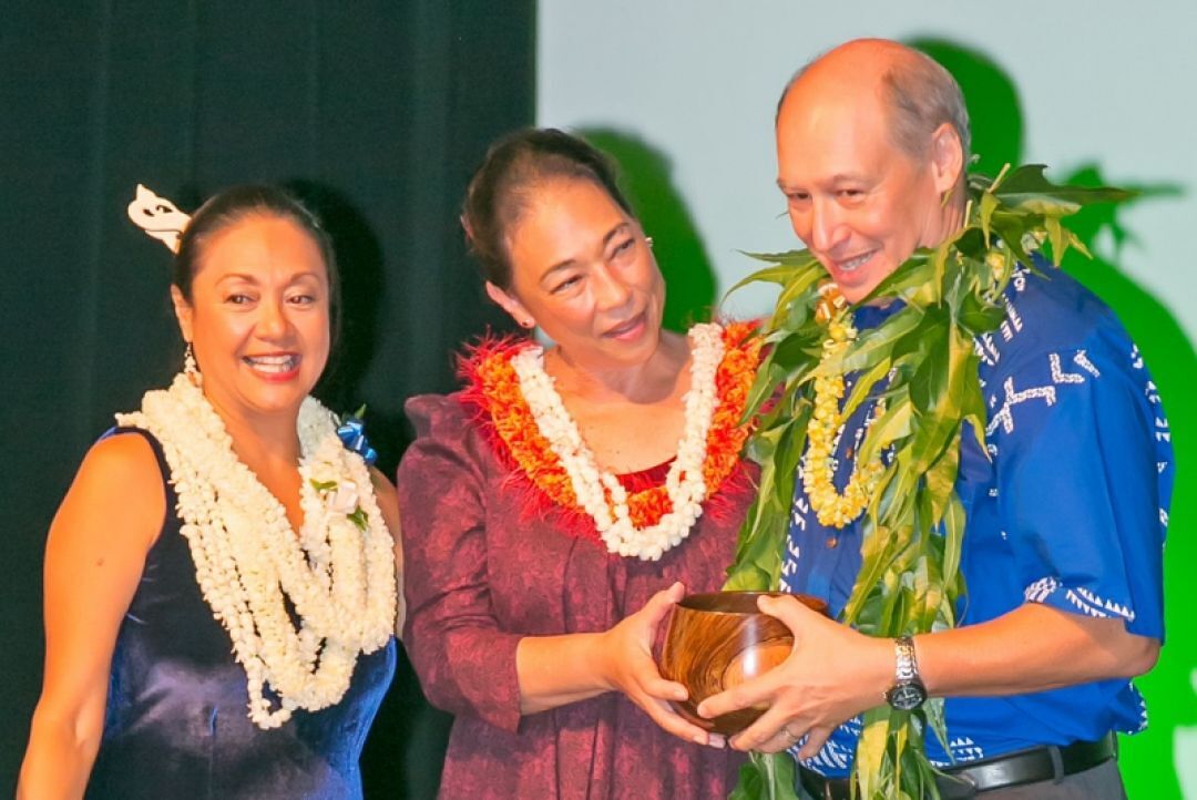 Maenette Benham, dean of UH’s Hawaiʻinuiākea School of Hawaiian Knowledge, and HHF Trustee Cissy Farm present Hannahs with the Kamaʻāina of the Year award.