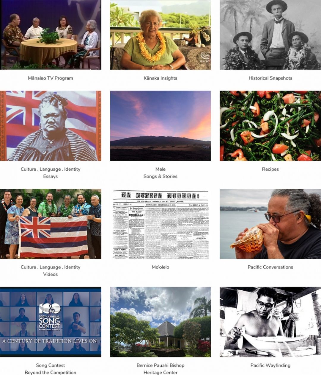 This section features 12 buttons, each leading to a unique and intriguing repository of Hawaiian knowledge. Topics include: traditional moʻolelo, historical accounts, kūpuna recollections, essays, recipes and video documentaries – all designed to allow ample opportunities for in-depth research and impulsive meandering for all ages.