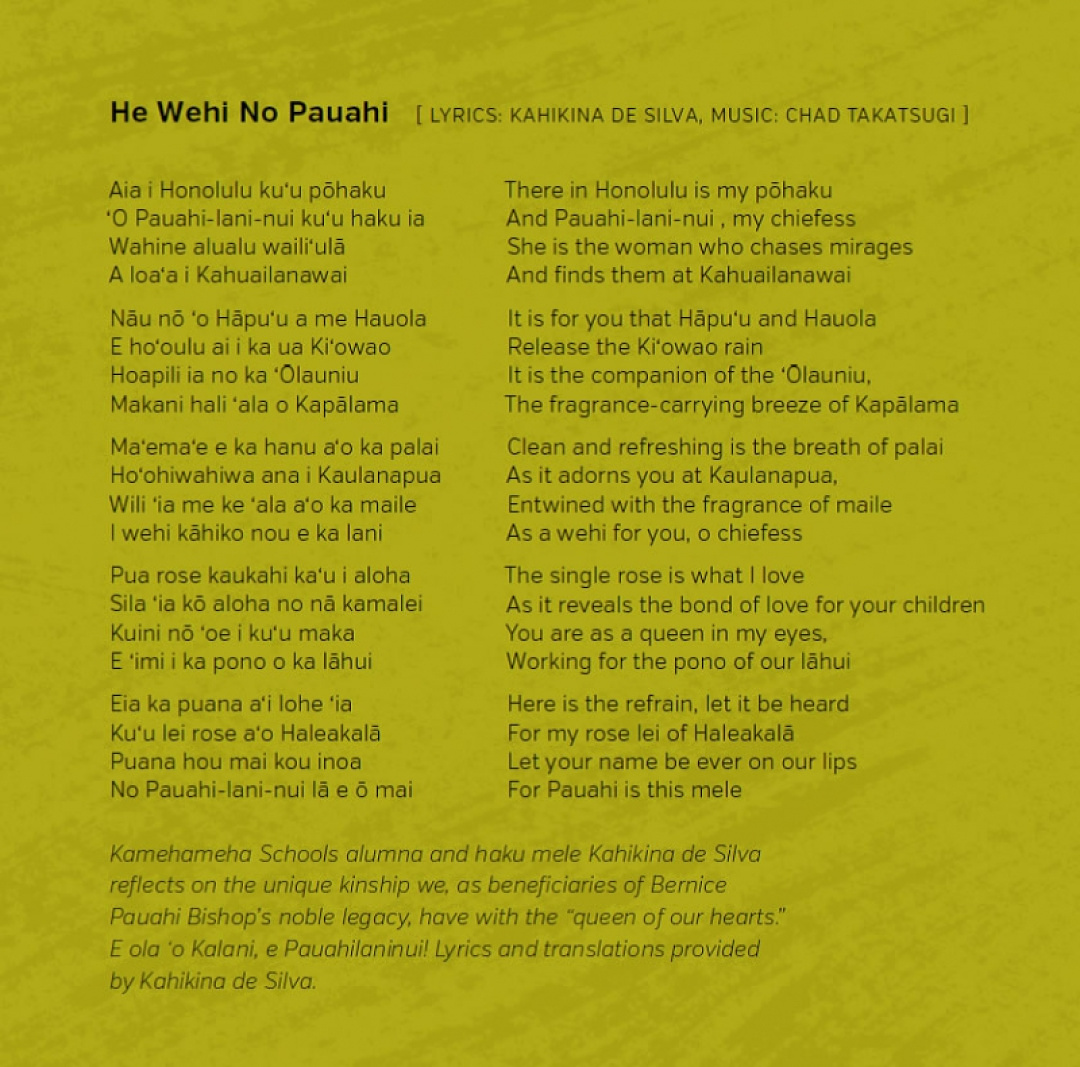 “The vision was to add to the library of mele that honor the name of Pauahi and to bring a new composition to Hawaiʻi’s listening audience that will remember the importance of her contributions,” Takatsugi said.