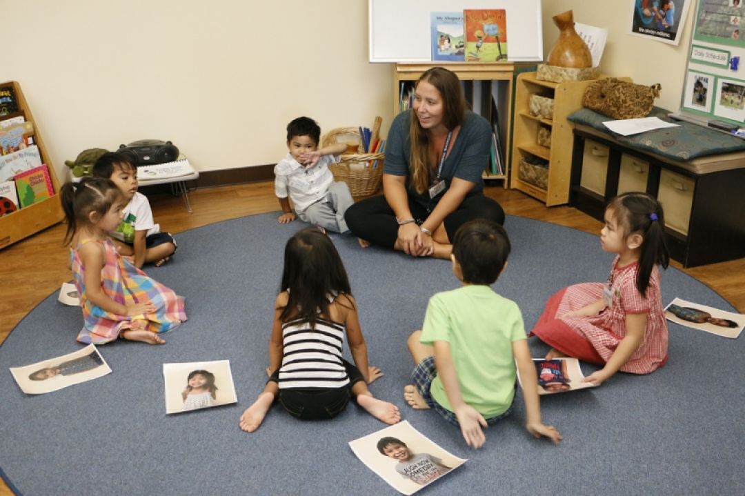 Kumu Leilani Pao introduces the keiki to circle time during their first day.