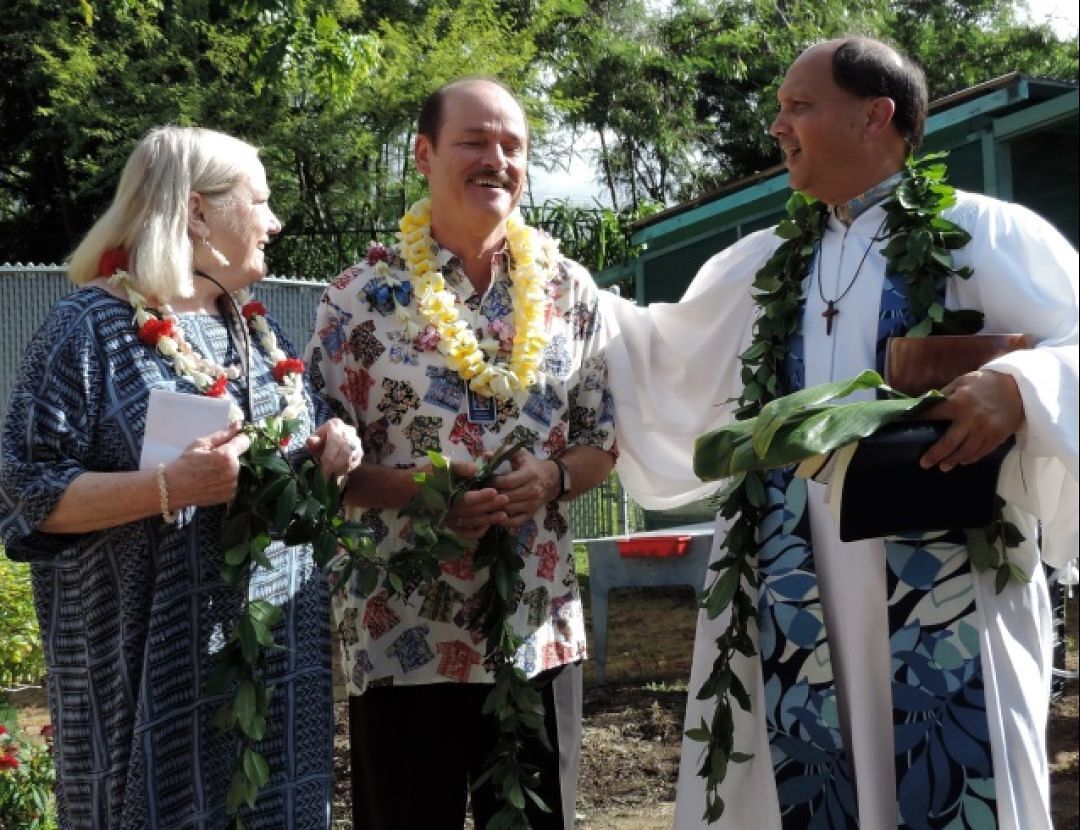 Nā Kula Kamaliʻi Poʻo Kula Terry Kelly, Executive VP for Education Holoua Stender and Kahu Kordell Kekoa enjoy a moment during the blessing of the Kapālama Preschool.