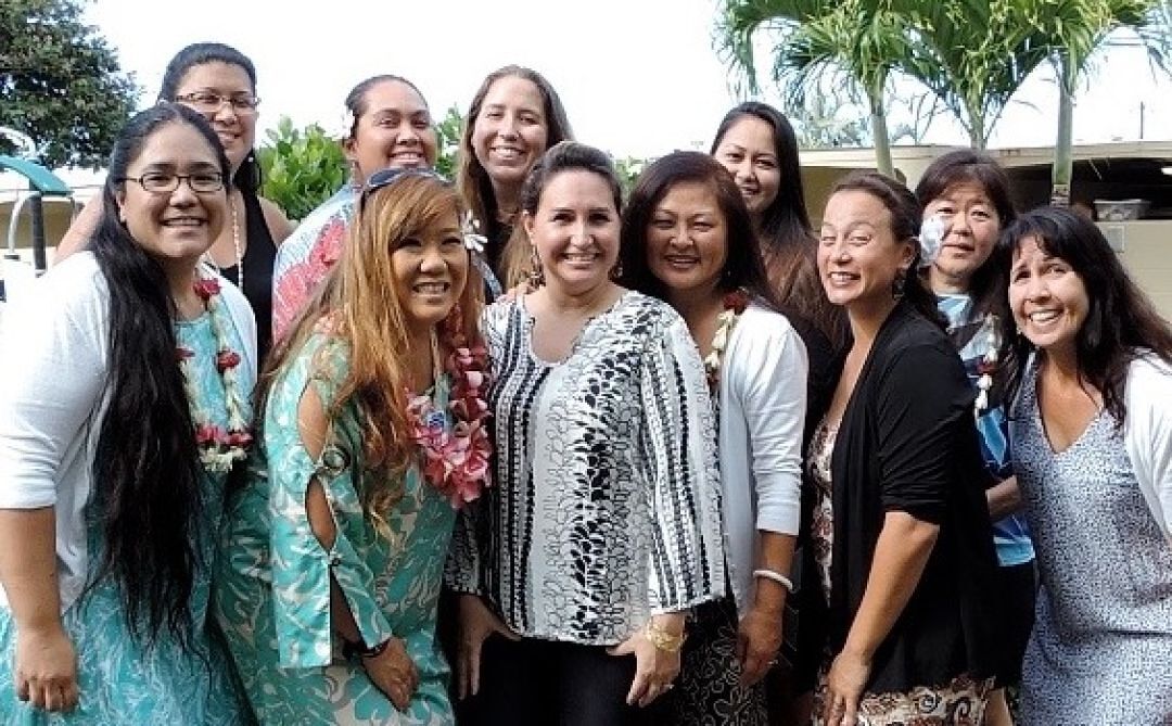 Kapālama Preschool kumu and teaching assistants. Front row (L to R): Kumu Kaleena Aoki, Teaching Assistant Sallie Yoza, Teaching Assistant Ranee Cofran, Kumu Renae Holt, Teaching Assistant Raelen Bajet, Teaching Assistant Stacie DeSilva. Back row: