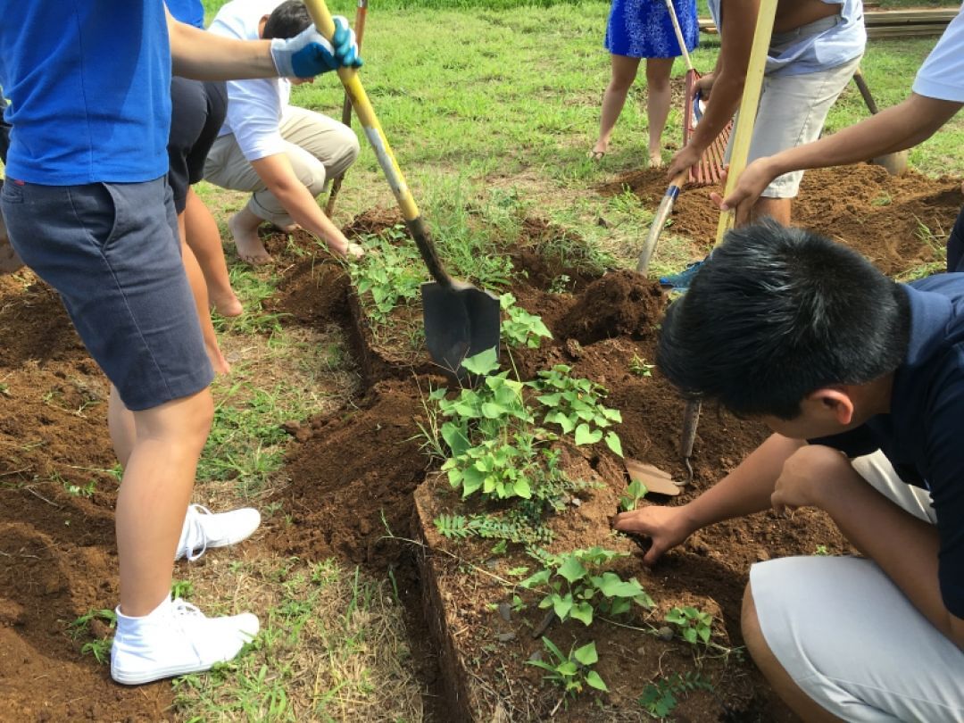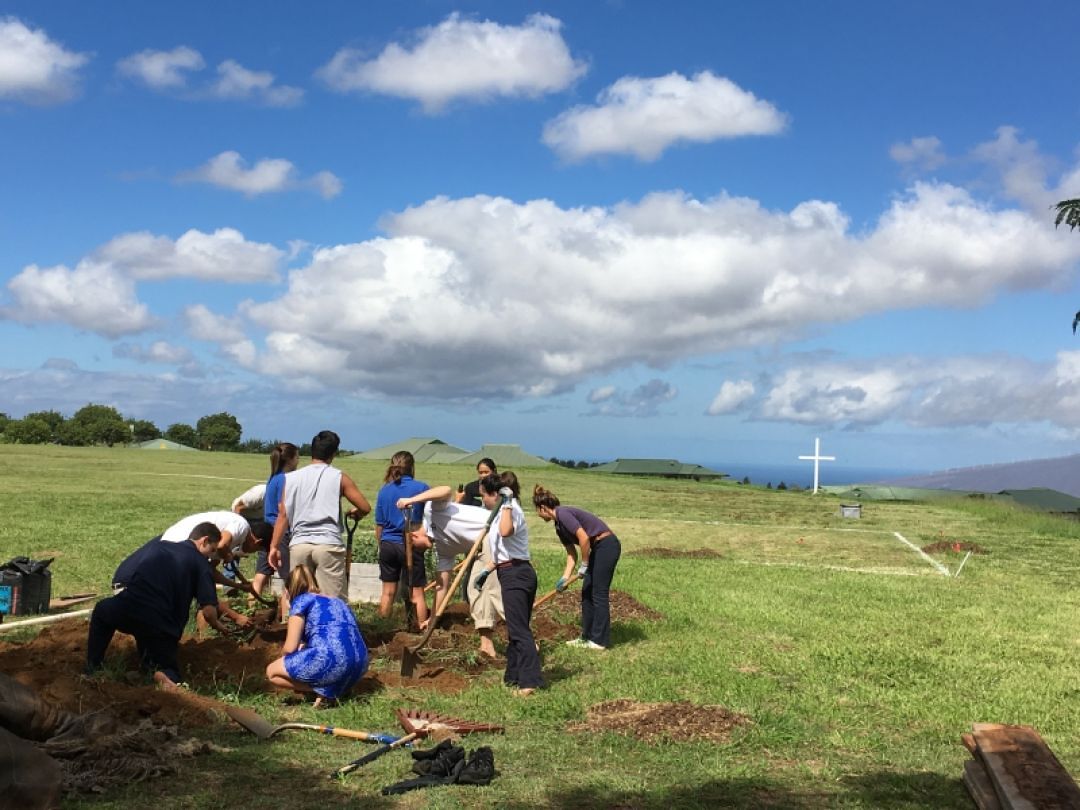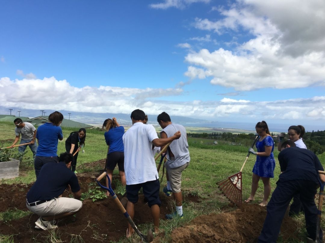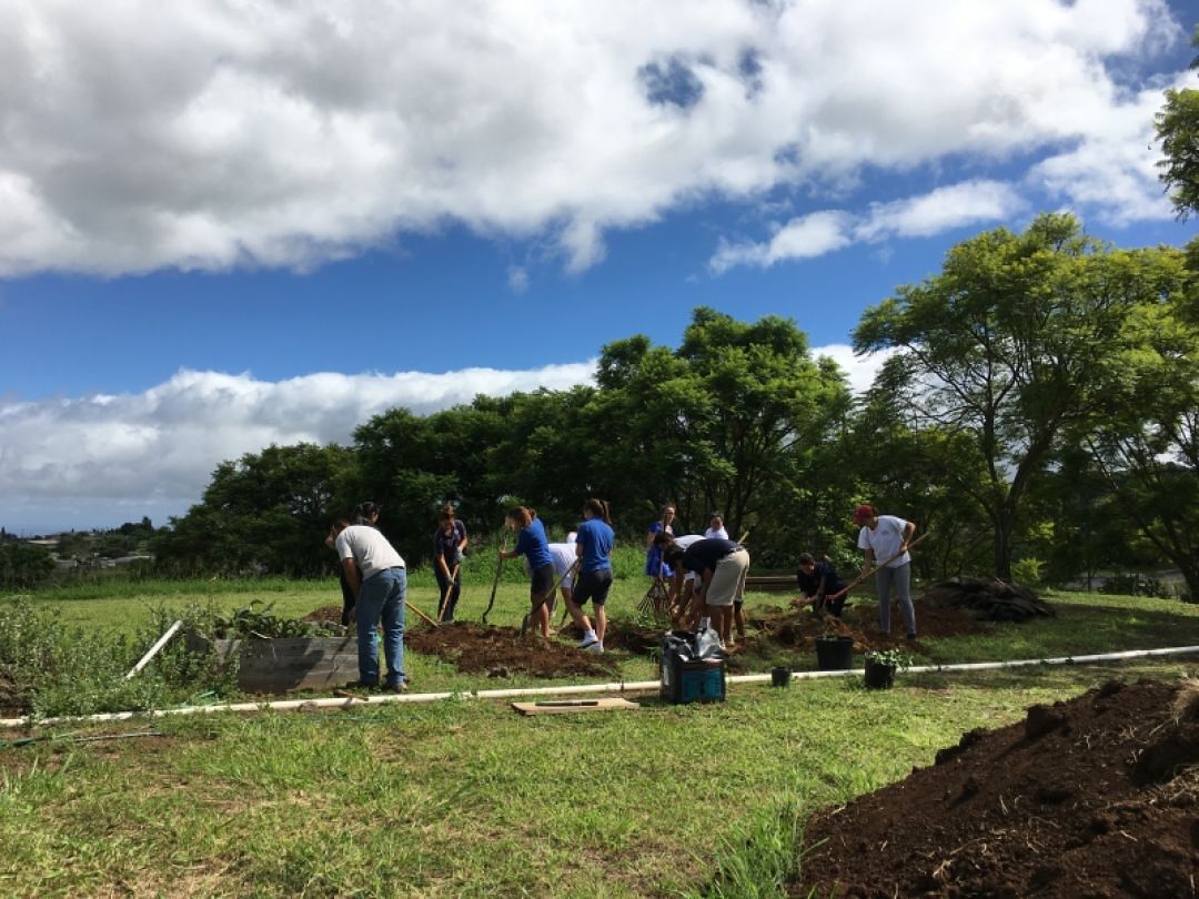 Kumu Kehau works with senior seminar students to prepare the garden for new plants. Kapikohānaiāmālama is the outdoor educational space for the K-12 students at the Maui Campus.