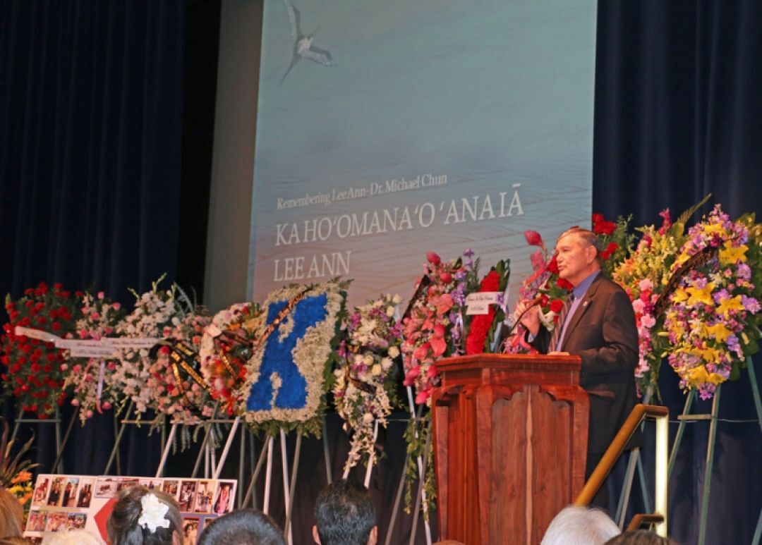 Retired KSK Head of School Dr. Michael Chun shares memories of Delima at a Nov. 20 memorial service on Maui. Many KSM alumni flew in for the event which was also attended by KS employees, retirees and friends.
