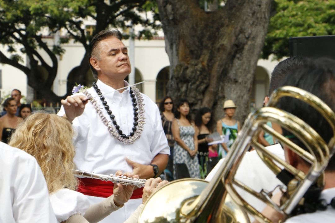 Royal Hawaiian Bandmaster Clarke Bright leads the band through a selection of Hawaiian mele to honor the queen at the 2015 'Onipa'a event.