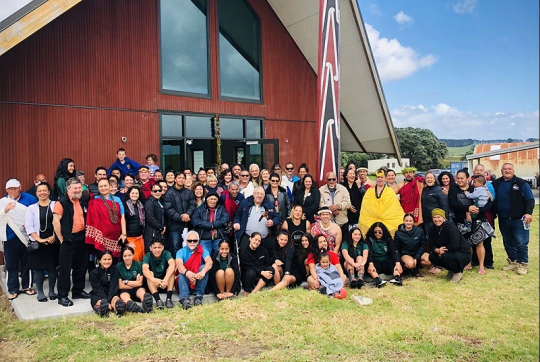 Ngāti Ruawāhia members from Kamehameha Schools and the Polynesian Voyaging Society, and the Māori community gather in front of Whetū Mārama in 2018. The lei piko hangs at the entrance.