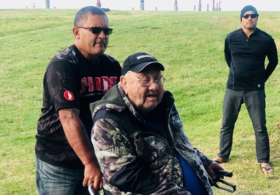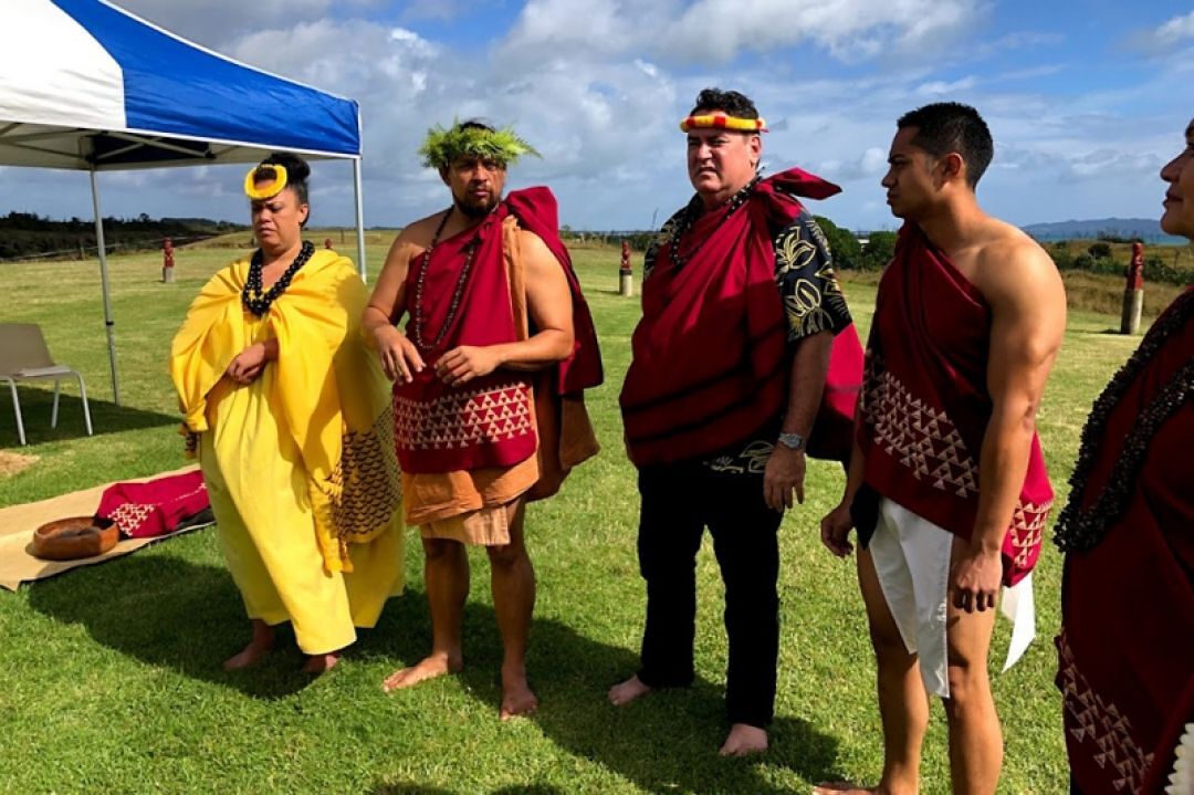 Māori master navigators Jacko Thatcher and Sir Hekenukumai Busby prepare for the ʻOki i ka Piko Ceremony. Vince Keala Lucero of Co-Creative Studios stands in the background.