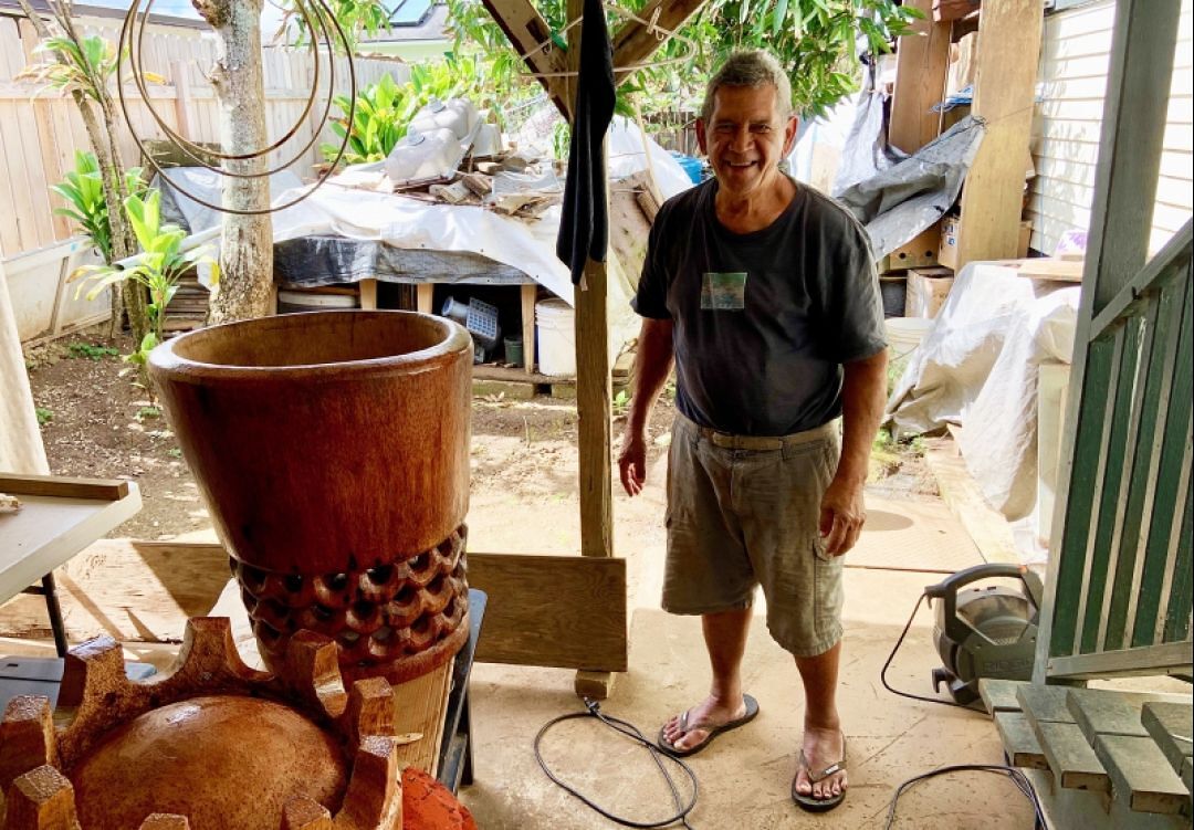 A humble and soft-spoken man, ‘Etua discovered his love of carving while attending Liahona High School in Tonga. In addition to learning to carve, he learned to lash Polynesian huts and create Polynesian artwork and instruments including coconut ʻukuleles and guitars.