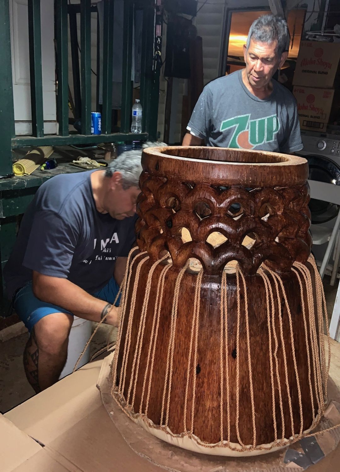 Sing and ‘Etua work on some of the final elements of the pahu.