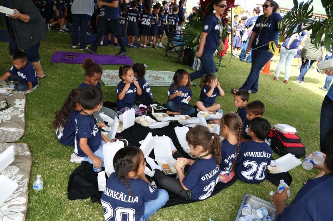 Even the preschool students joined in the lū‘au on the kula ki‘eki‘e quad field, getting their fill of Hawaiian food.