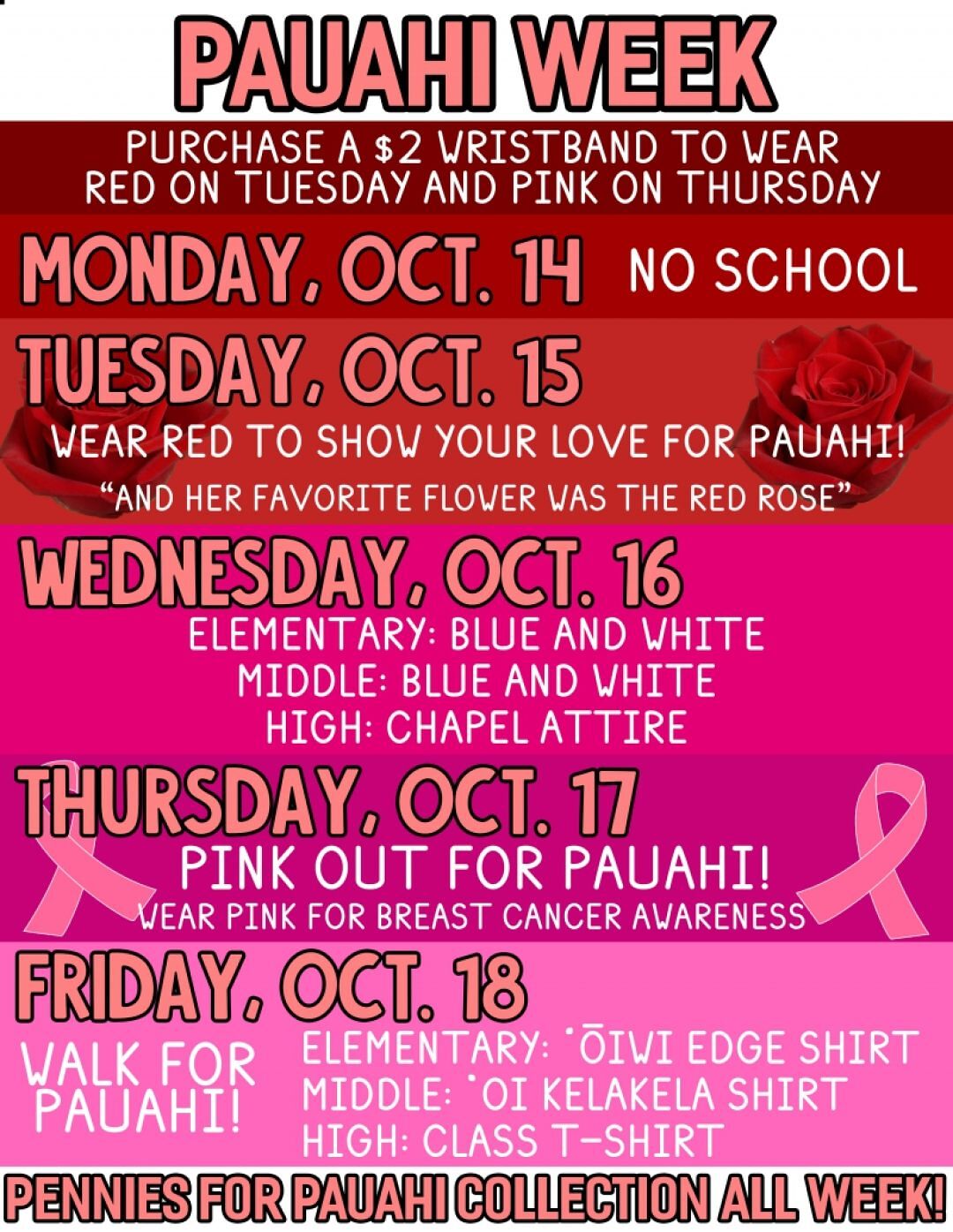 To participate in the special dress days, staff and students have purchased special Pauahi themed pink wristbands with all proceeds will be donated to the Pauahi Foundation. And throughout the week, kula will hold their Pennies For Pauahi collection, raising funds for the Pauahi Foundation.