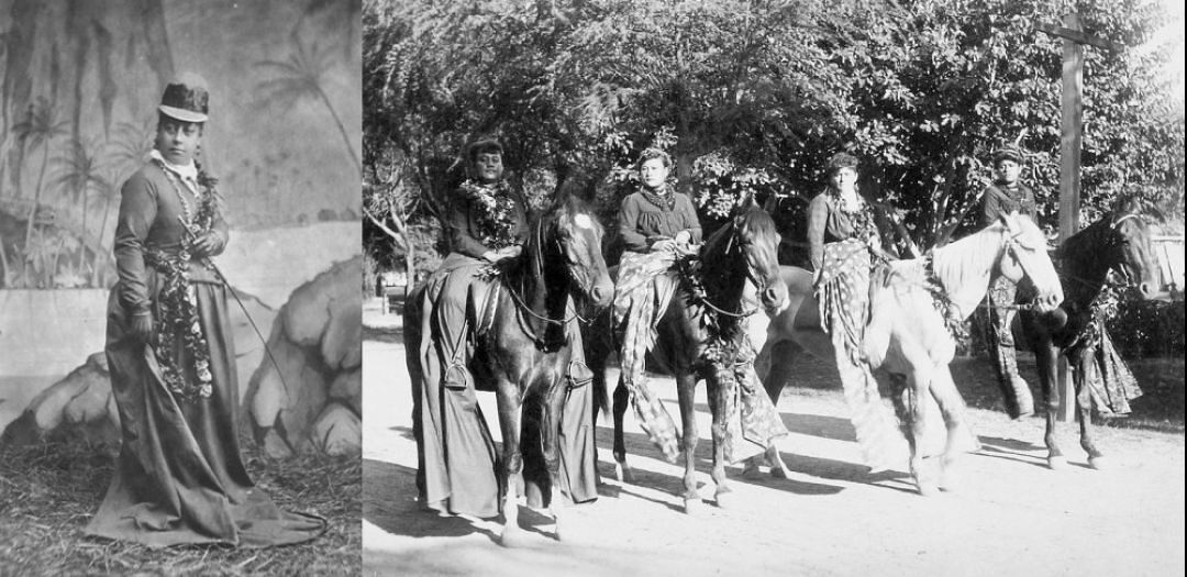 Left: Queen Emma in a riding habit, 1880. Courtesy of Hawaiʻi State Archives. Right: A group of Pāʻū riders, ca. 1880s. Courtesy of PBA Galleries.
