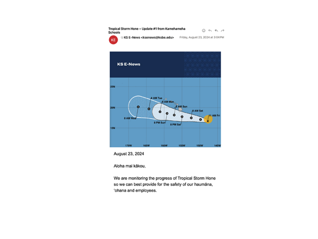 If a storm is forecast to have an impact on our pae ʻāina, messages will be shared from the Kamehameha Schools CMT with our entire KS ‘ohana: