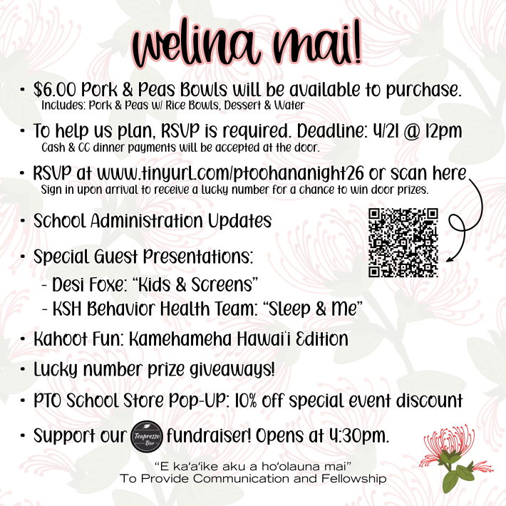 Please join the Kamehameha Schools Hawaiʻi Parent Teacher ʻOhana (PTO) on Tuesday, April 28th for the annual PTO ʻOhana Night! Dinner at 5:30 p.m. with the meeting starting at 6:00 p.m. in Hāʻaeamahi Dining Hall.