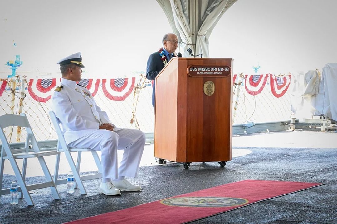 Vice Admiral Robert Kihune KSK’55, who retired from the Navy in 1994 after 35 years of service and went on to serve as a Kamehameha Schools Trustee, presided over Mahelona’s promotion ceremony on the deck of the U.S.S. Missouri on Oct. 5.