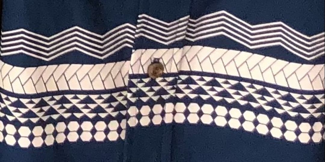 The four elements of Keha's Panepo'o Kehakeha print design -- five mountains, Hilo braid, a barbed spear and kukui nuts.