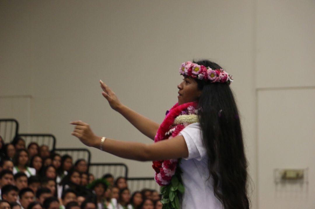 Mauliola Gonsalves led the senior class in “He ‘Olu,” winning the class both the “Ka Maka o ka Ihe” and “Ka Hulu Kupuna” awards.
