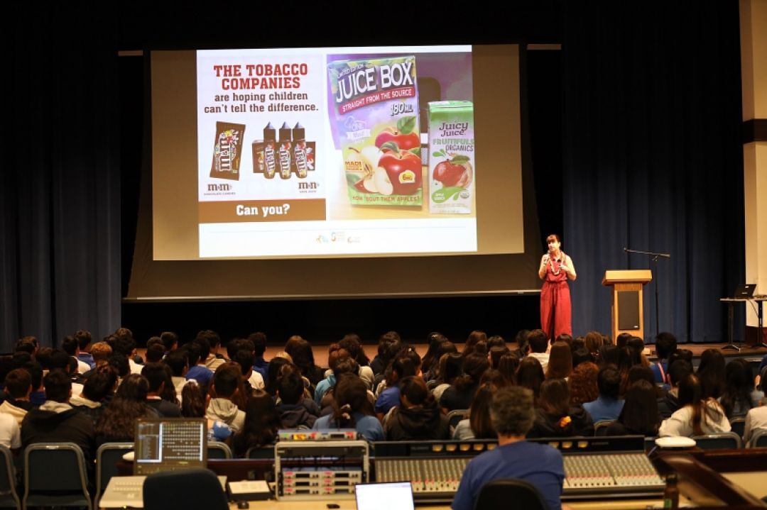 Local expert Sally Ancheta presents to Kamehameha Schools Hawai‘i high school students about the dangers of vaping and how companies are targeting them.