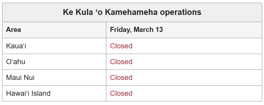Our Hawaiʻi Island campus, preschool sites and offices are closed today, Friday, March 13, 2026. As we shared yesterday, Ke Kula ʻo Kamehameha campuses, preschool sites and offices on Kauaʻi, Oʻahu, Molokaʻi and Maui are also closed today. These decisions follow state and county closures as the Kona storm continues to impact the islands. They also reflect our commitment to the safety and well-being of our haumāna, ʻohana and staff.