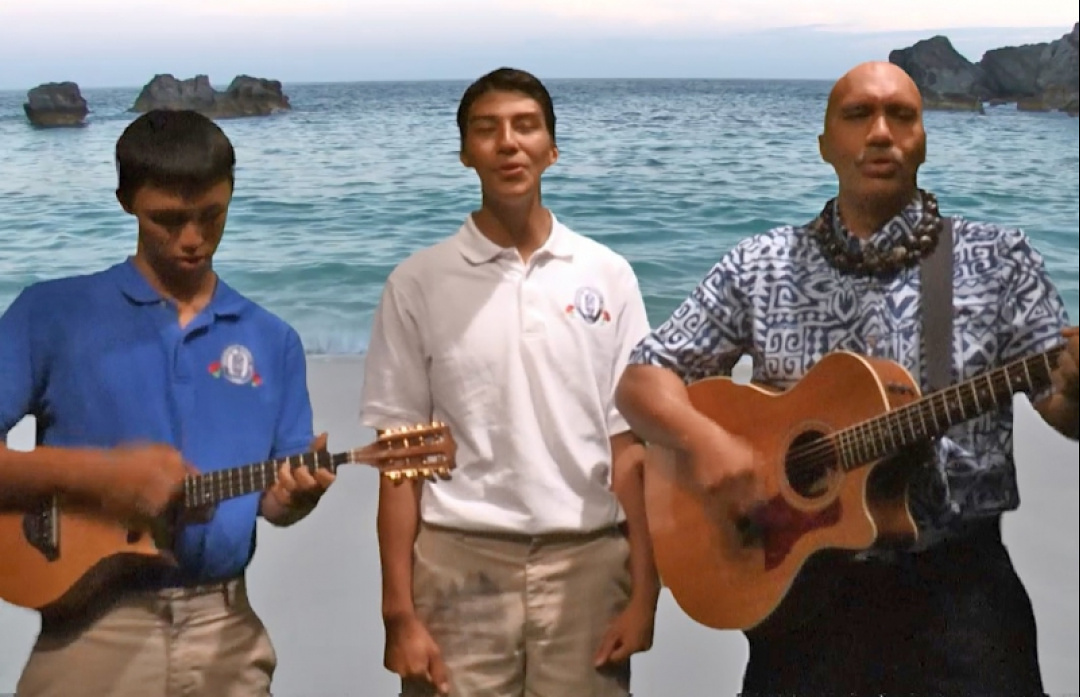 Kahu Kaunaloa (right) and his students John McCollum IV and Israel Mata sing this week’s hymn. Sing along by viewing the video below.
