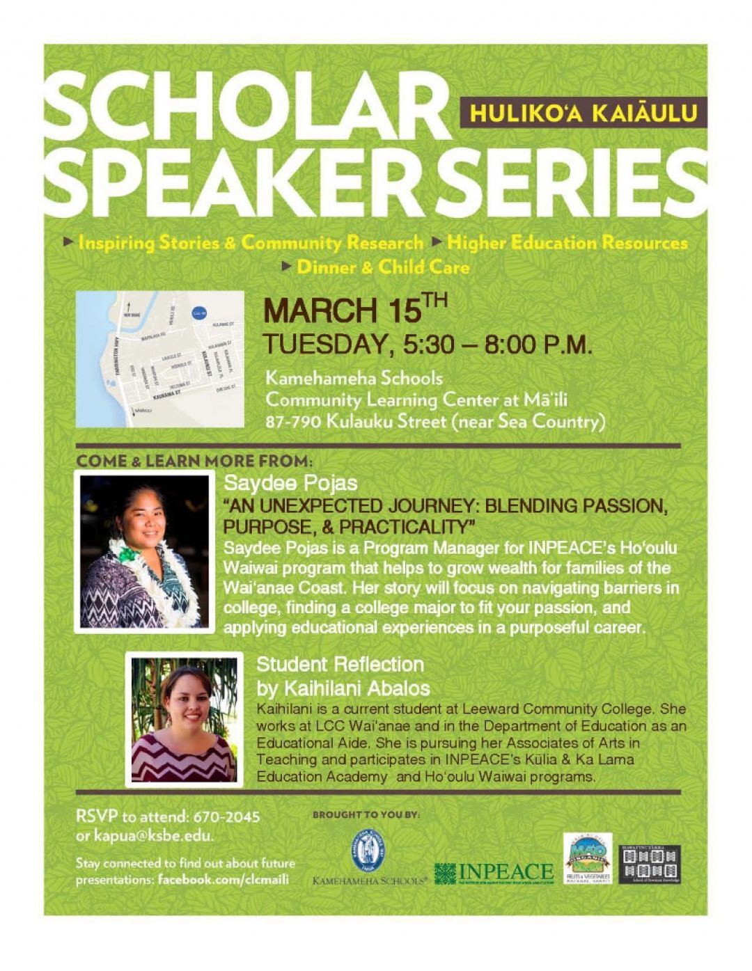 Saydee Pojas, is the program manager for INPEACE’s Hoʻoulu Waiwai program which helps to grow wealth for families of the Waiʻanae Coast. She will share her moʻolelo on navigating barriers in college, finding a college major to fit your passion, and applying educational experiences in a purposeful professional career.