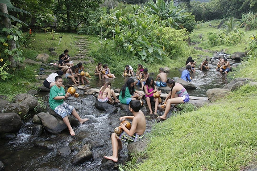 Ho‘omāka‘ika‘i students clean their ipu in Waipao. Generations of past participants still have this treasured keepsake from their weeklong Explorations Series experience.