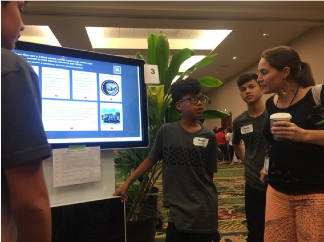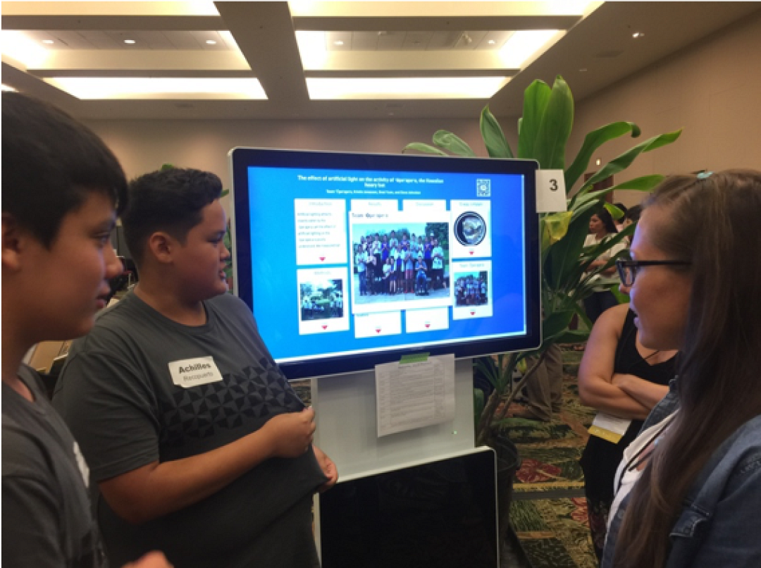 Team ʻŌpeʻapeʻa members explain to attendees of the Hawaiian Convention Center about the experiments conducted and the results gathered by the team.