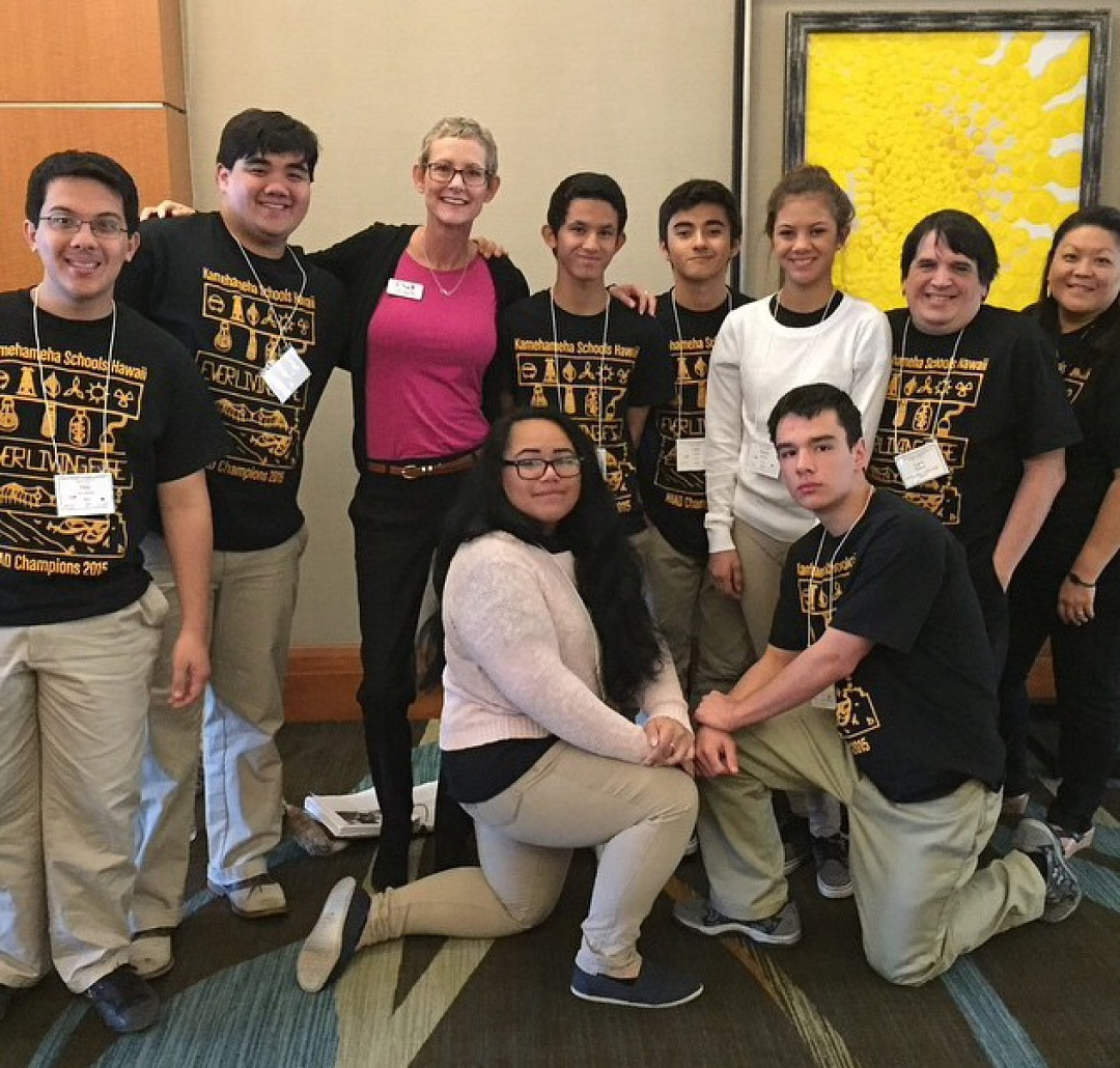 The KS Hawai‘i team gathers around state academic decathlon coordinator Cindy Martisko.