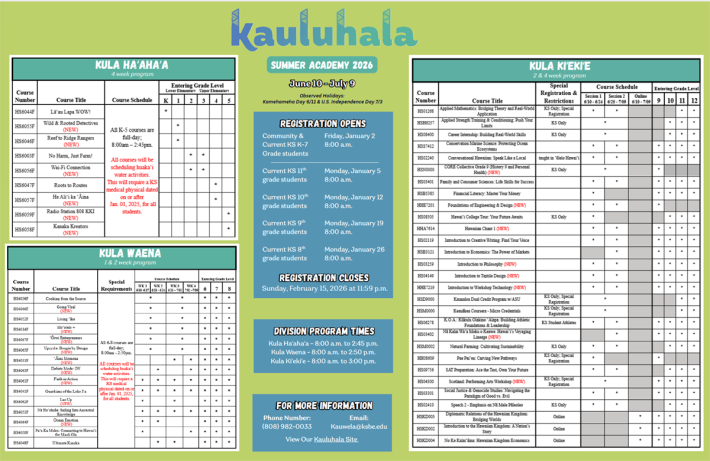 The deadline to sign up for summer courses with the Kauluhala Summer Academy is quickly approaching! Be sure to register your keiki for a class they are interested in by this Sunday, February 15, 2026!