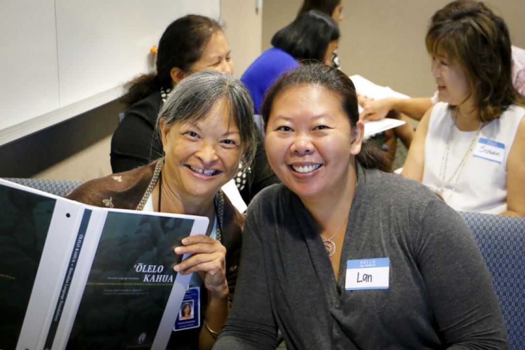 Kamehameha staffers, including Davi Kunishige and Lan Tu, began Hawaiian language lessons led by KS’ Hoʻokahua Cultural Vibrancy Group.