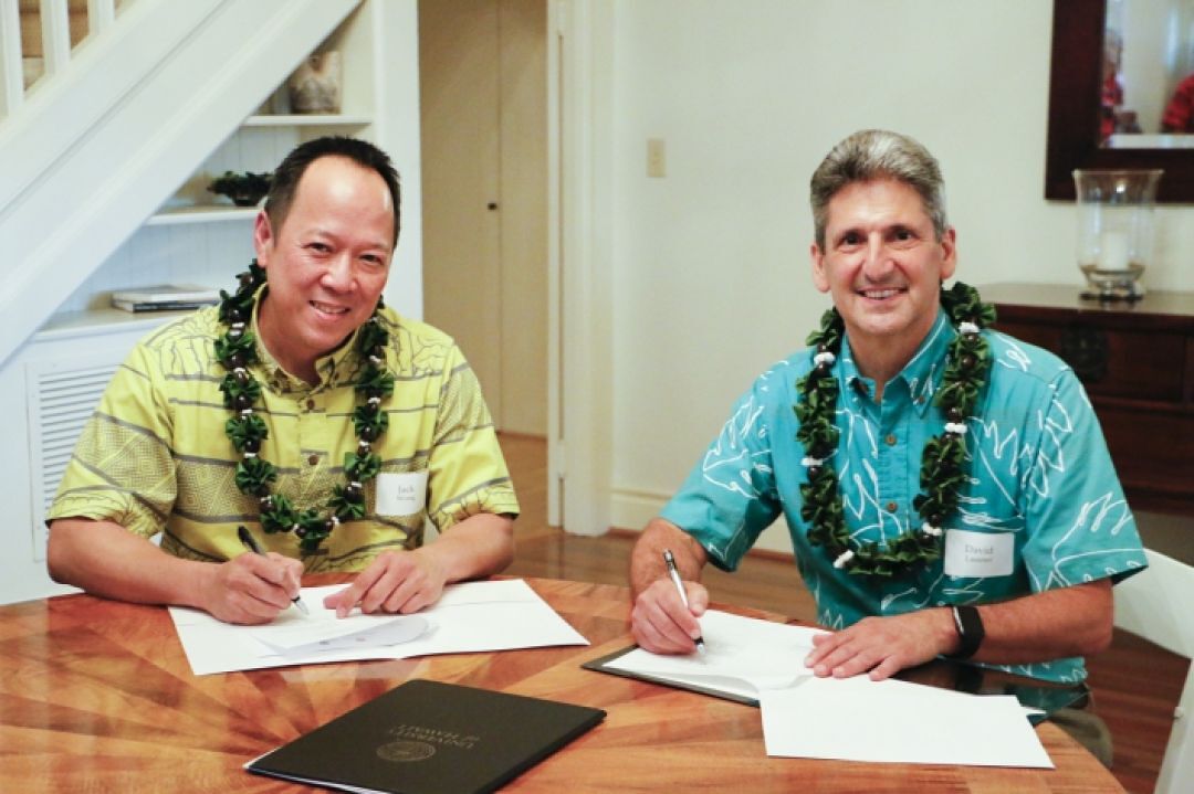 KS formalized partnerships with the UH System to help Hawaiian learners achieve postsecondary success. Above, KS CEO Jack Wong and UH System President David Lassner sign a memorandum of understanding for the KS-UH partnership.