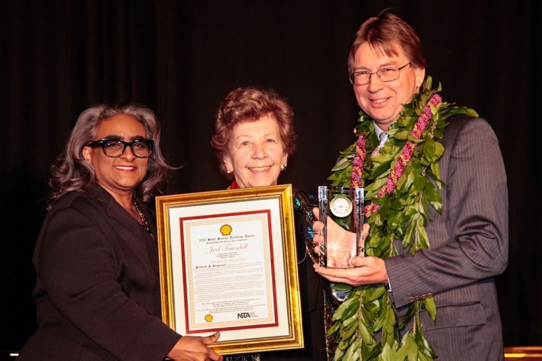 Karen Labat (Social Investment Manager at Shell Oil Company) and Mary Gronko (NSTA President) present Joel Truesdell with the 2017 Shell Science Teaching Award at the NSTA Teacher Awards Gala on Mar. 31.
