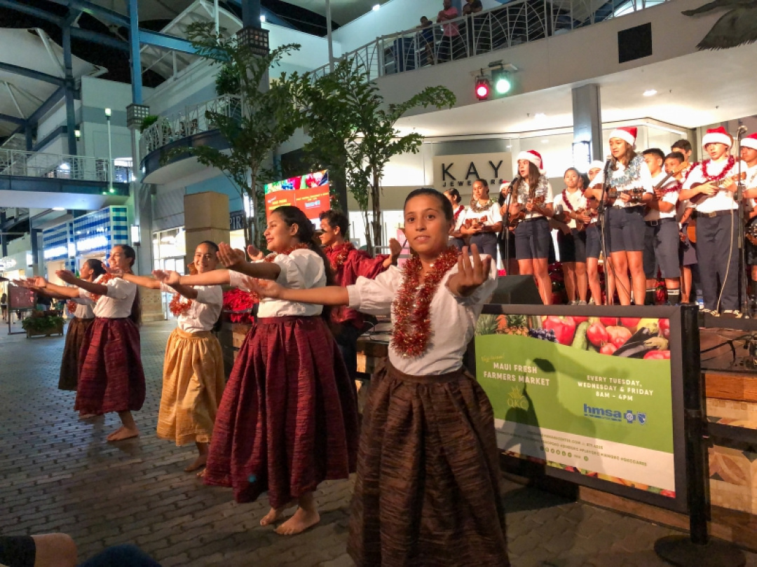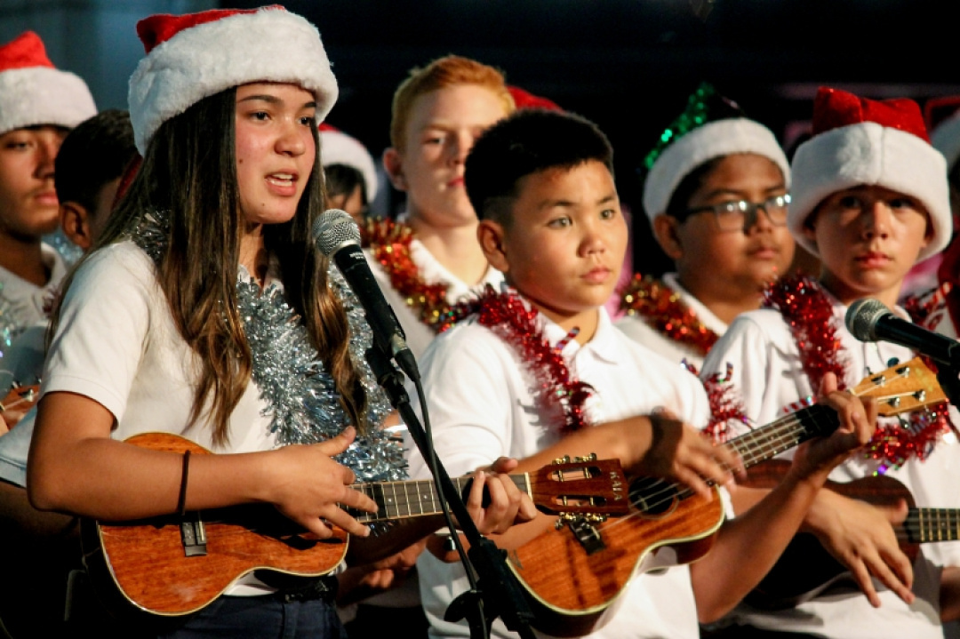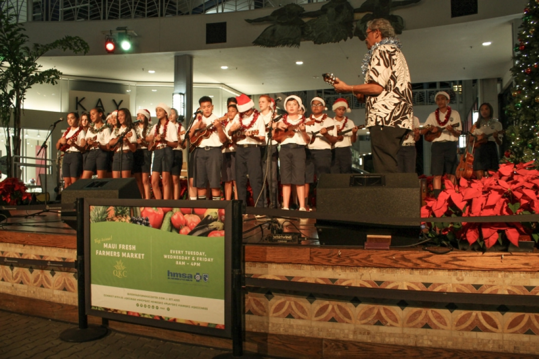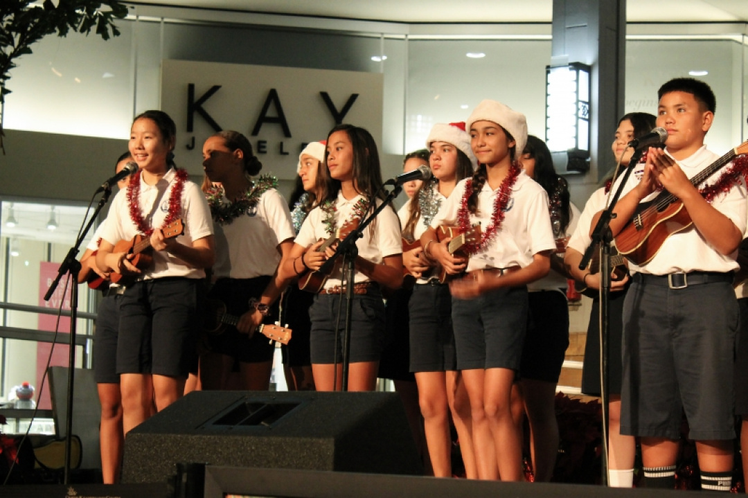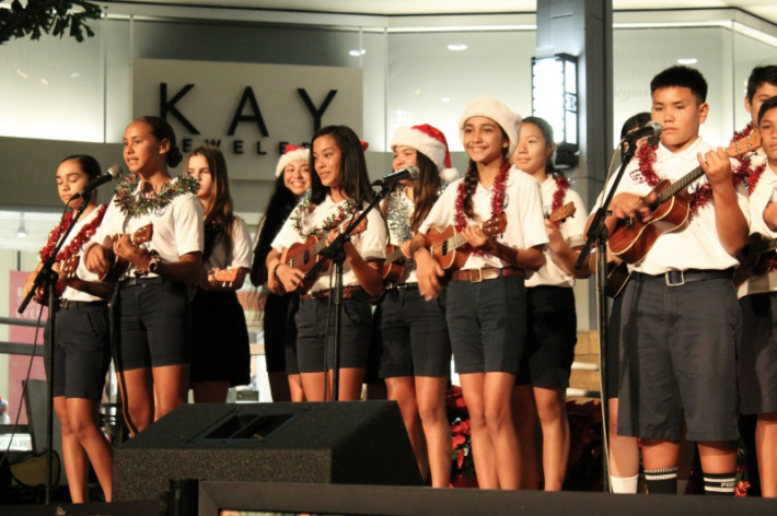 The night was filled with the sound of ukulele’s and our haumānaʻs voices as they performed for an audience and shopper as Queen Kaʻahumanu Shopping Center Wednesday night and accompanied by the MS E mi mau class. The 8th-grade Ukulele class was accompanied by their fellow 7th-grade classmates as they played a 17 song set which included Christmas music and hula. The crowd enjoyed the performance and our haumāna played their instruments with joy and danced beautifully. Big mahalo to Kumu Camarillo & Kumu Hoewaa for their dedication to our haumāna. Their performance is a reflection of their love for the ukulele, hula, and educating our haumāna.