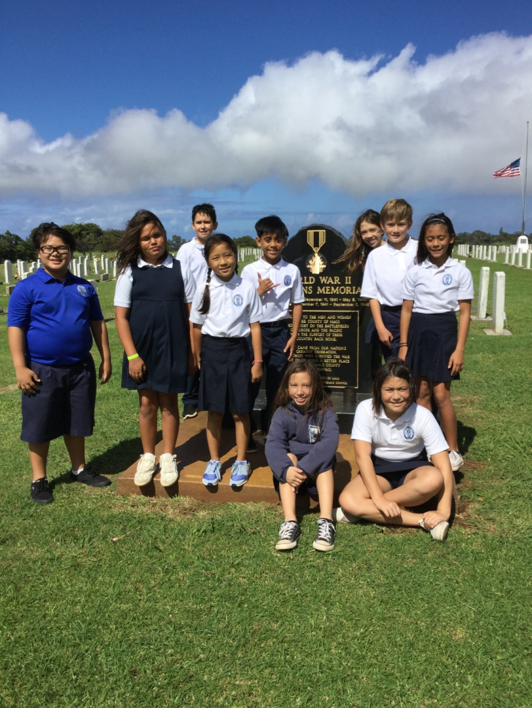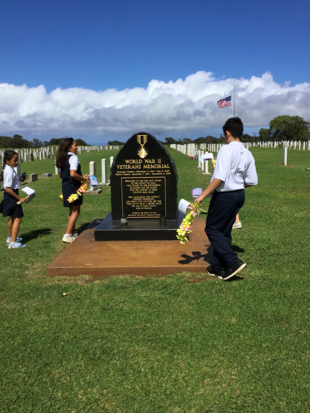 As we enter the Holiday season, the students of Hui Ho’okele wanted to remember all our Veteran’s, both past and present, and Mahalo them for all they have done for us. Several Hui Ho’okele students were able to place flags and lei, which were made by our student body, at the Veteran’s cemetery to show their Aloha. Several visitors expressed their gratitude for our efforts. It was a beautiful day!