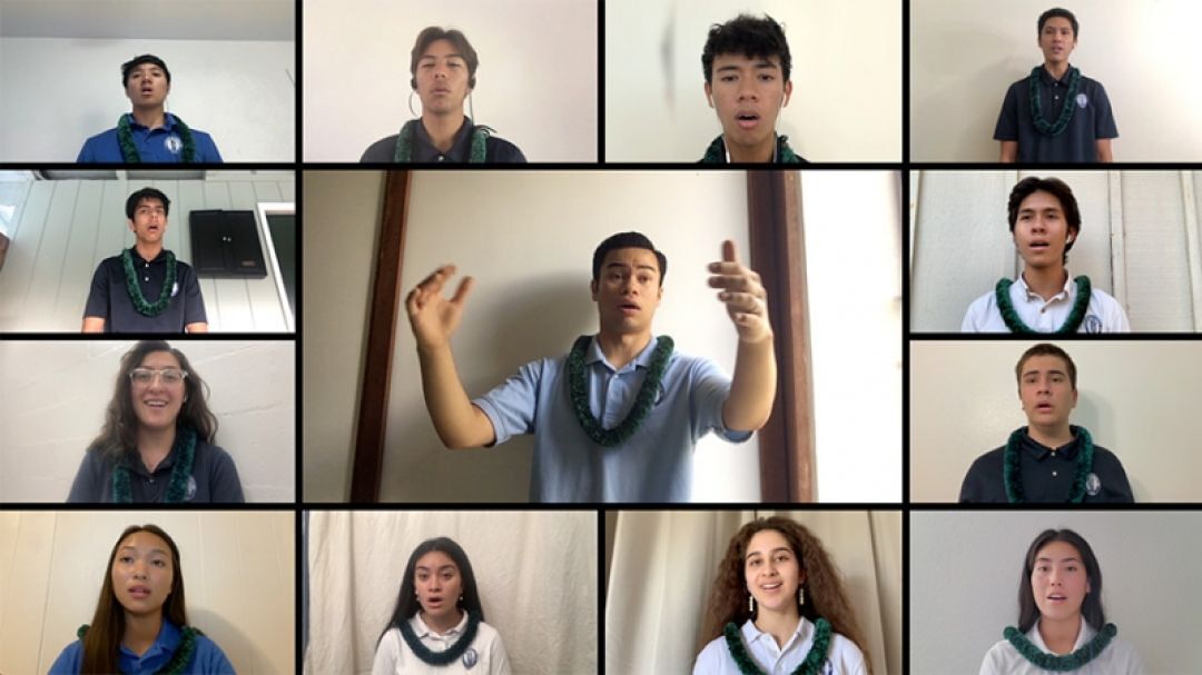 Adorned in their class color, ‘ōmaʻomaʻo (green), KS Kapālama seniors virtually perform their co-ed mele, “Ola nā ‘Ōiwi Aloha ‘Āina,” under the direction of Josias Pilināmakaika‘oia‘i‘o Ka‘upu Fronda.